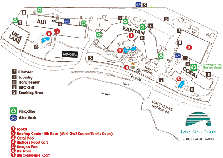 If you miss this entrance, there is a second entrance at the torch lit Lawai Beach Resort property sign between the Banyan and Alii Buildings (turn right and the Banyan will then be on your right).